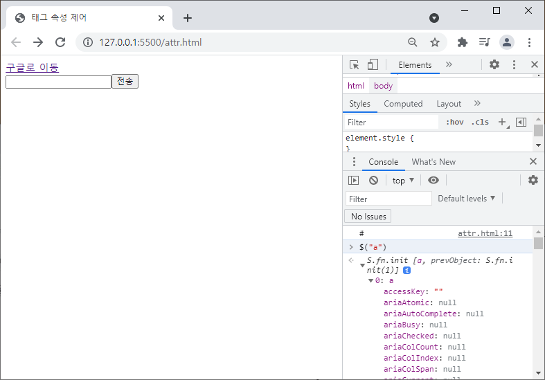 ※ console 에 $("a") 입력시 해당 요소에 대해 나온다. id를 입력 하지 않았으면 id의 기본값인 "" blank 이다. id가 없지는 않음.