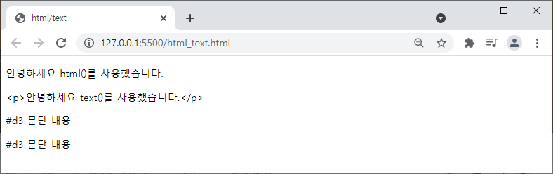 $("#d2").text("<p>안녕하세요 text()를 사용했습니다.</p>");