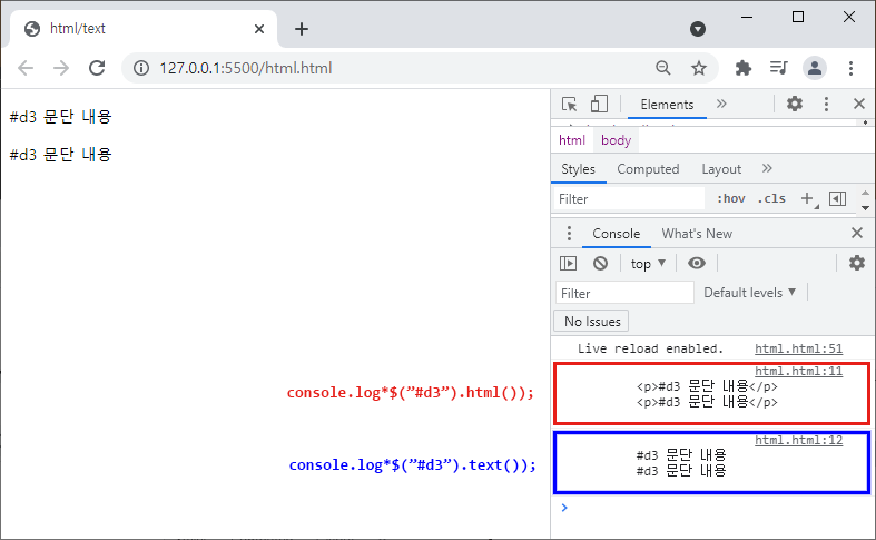 .html(): 해당 요소의 HTML 콘텐츠를 반환하거나 설정.text(): 해당 요소의 텍스트 콘텐츠를 반환하거나 설정
